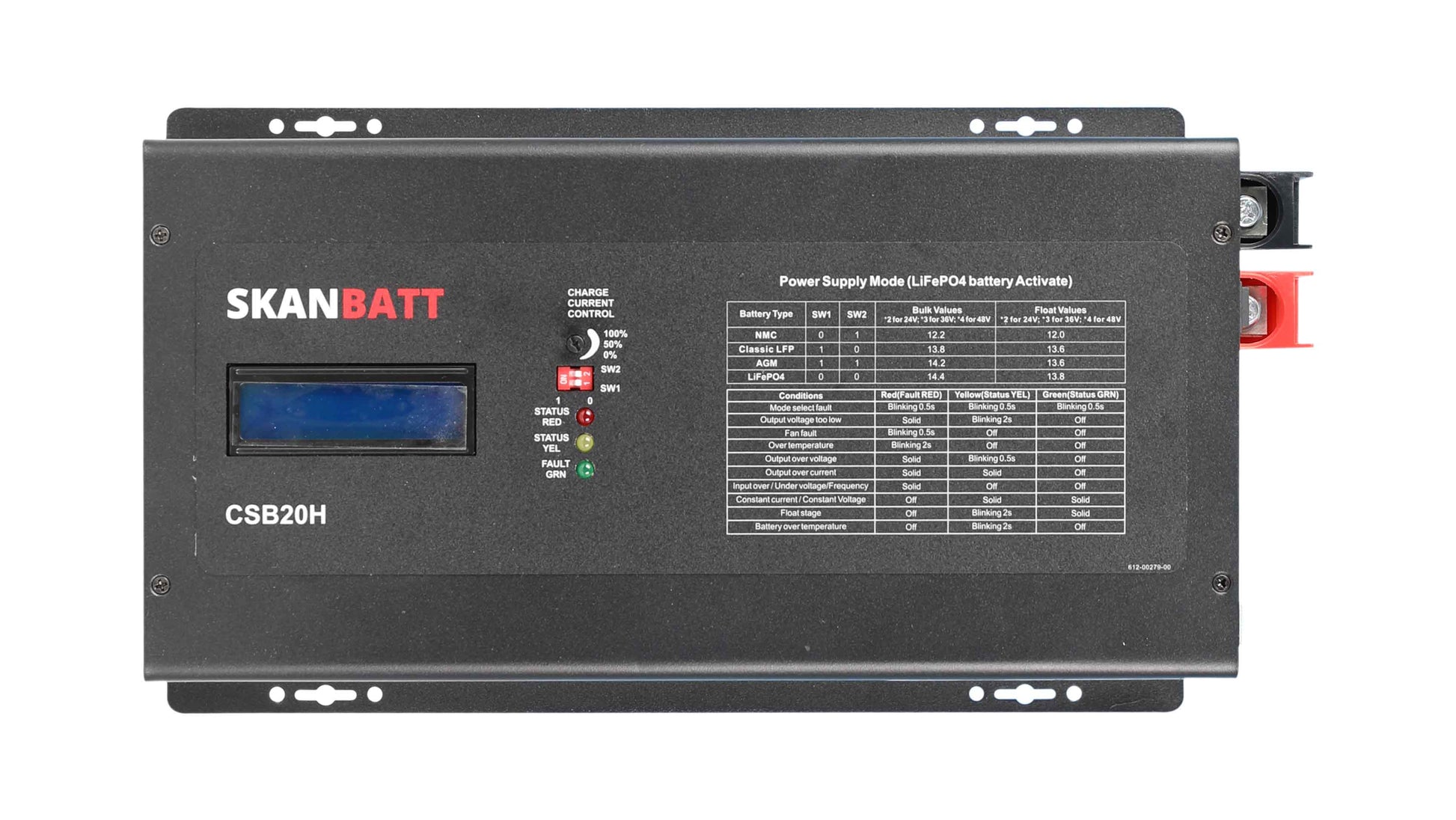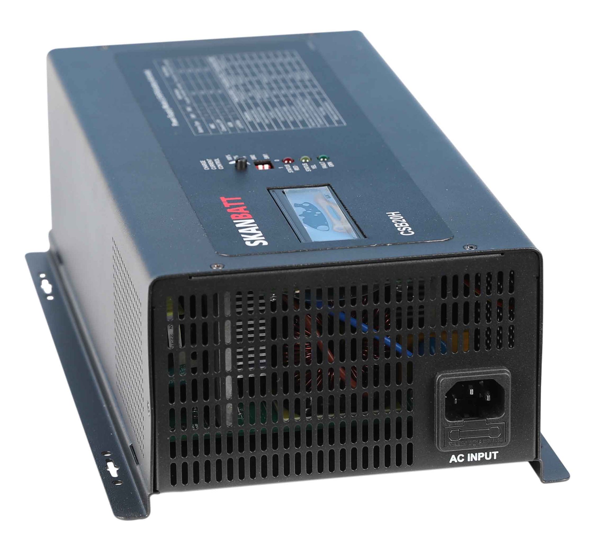 Skanbatt 2kW 36/48V DC - 230V AC batterilader gir rask, trygg og stabil lading. Med høy ladeeffektivitet, justerbar ladestrøm og støtte for flere batterityper, passer den for både profesjonell bruk og fritid.