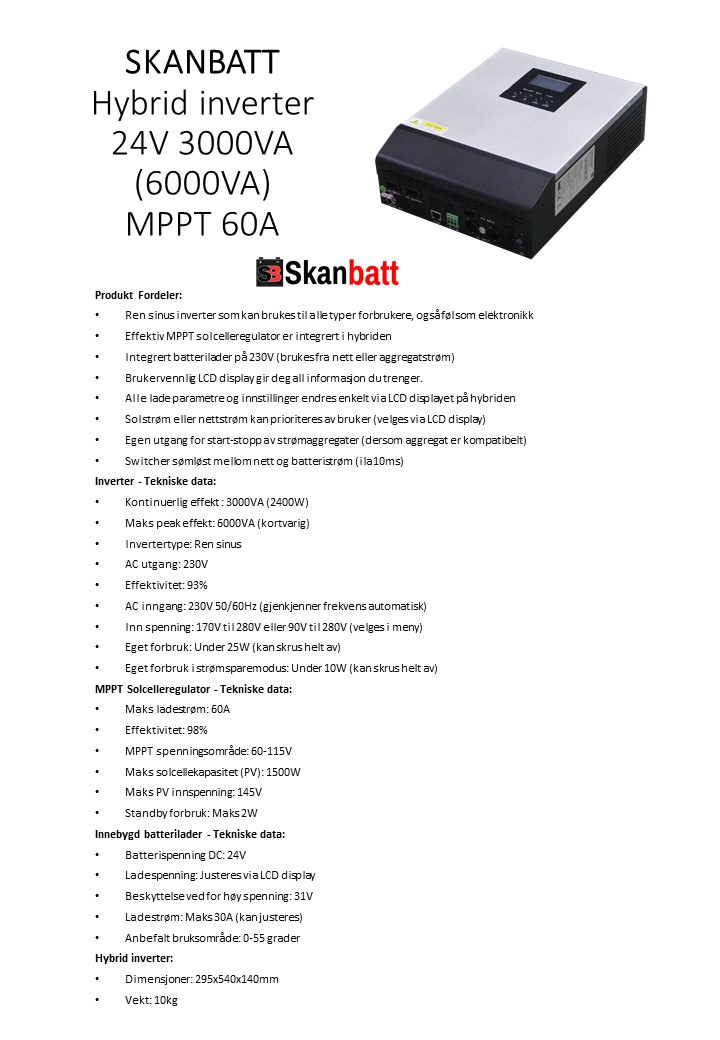 Hybridinverter fra SKANBATT som samler inverter, MPPT solcelleregulator og 230V batterilader i én enhet. Velegnet i kraftpakker der du vil ta ut 230V (AC) fra en batteribank (DC), for eksempel på hytta.