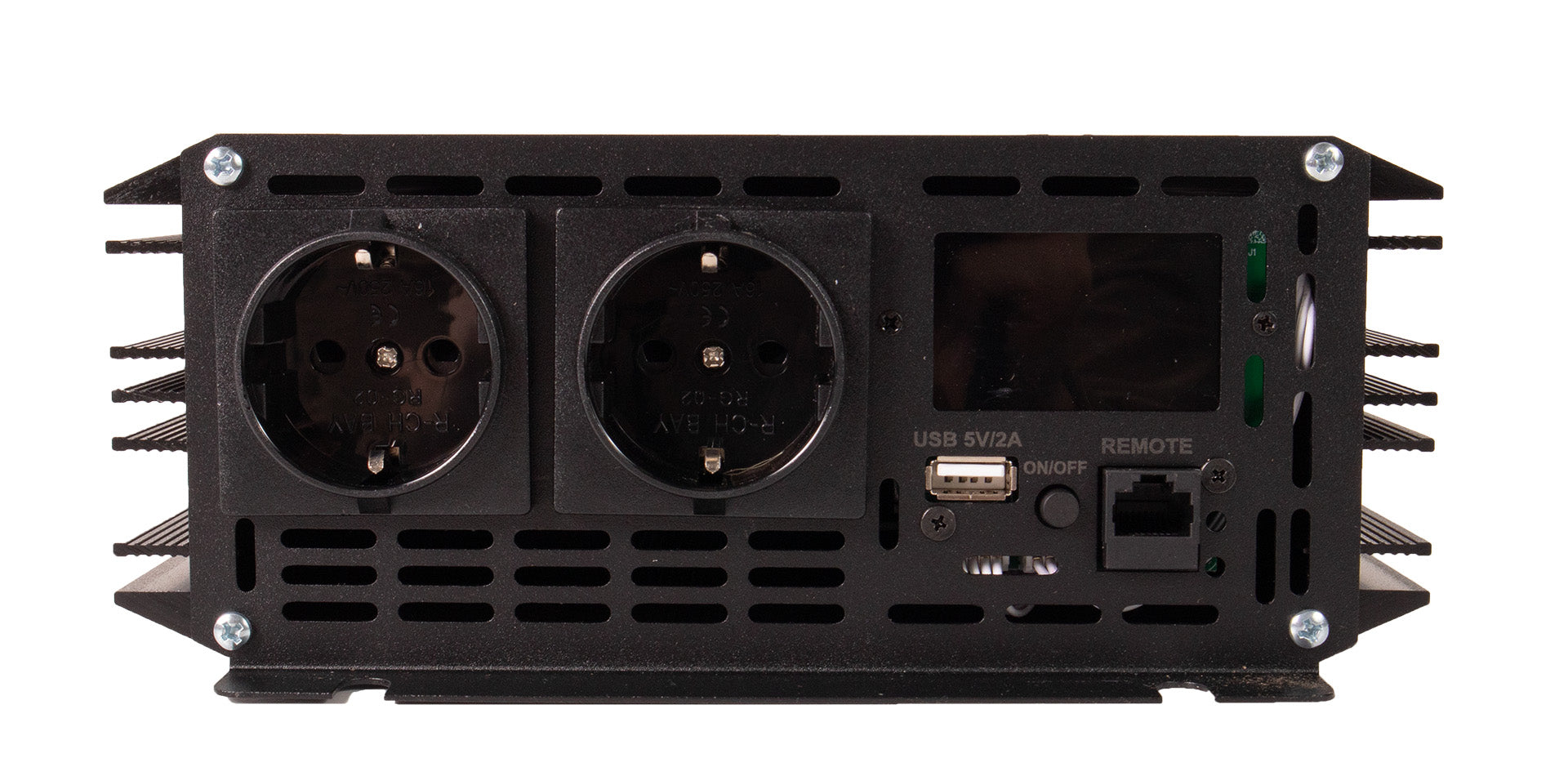 Frontdisplay viser batterispenning, frekvens og temperatur. Innebygd USB-utgang kan brukes til lading av mobiltelefoner og annet småutstyr.