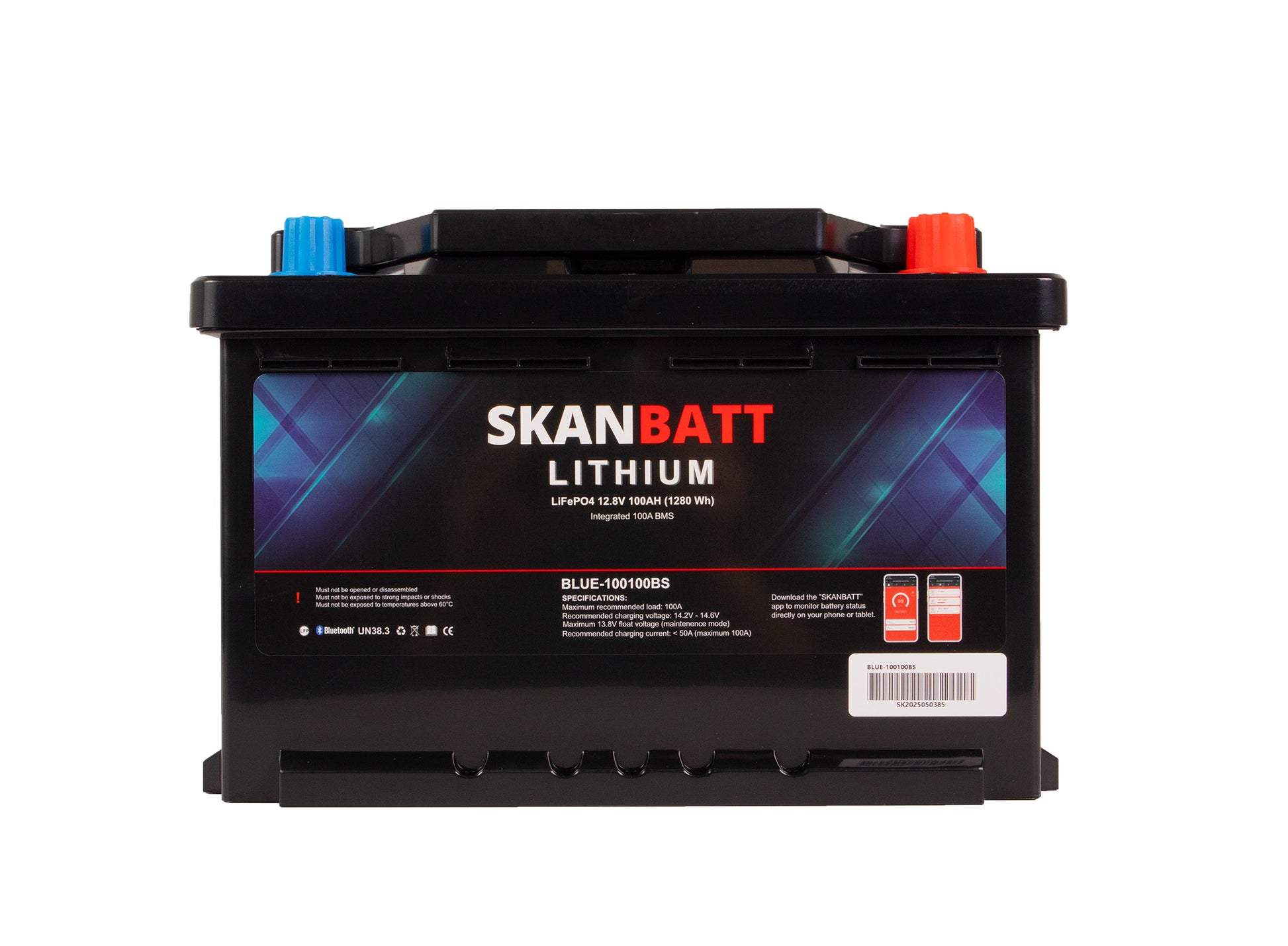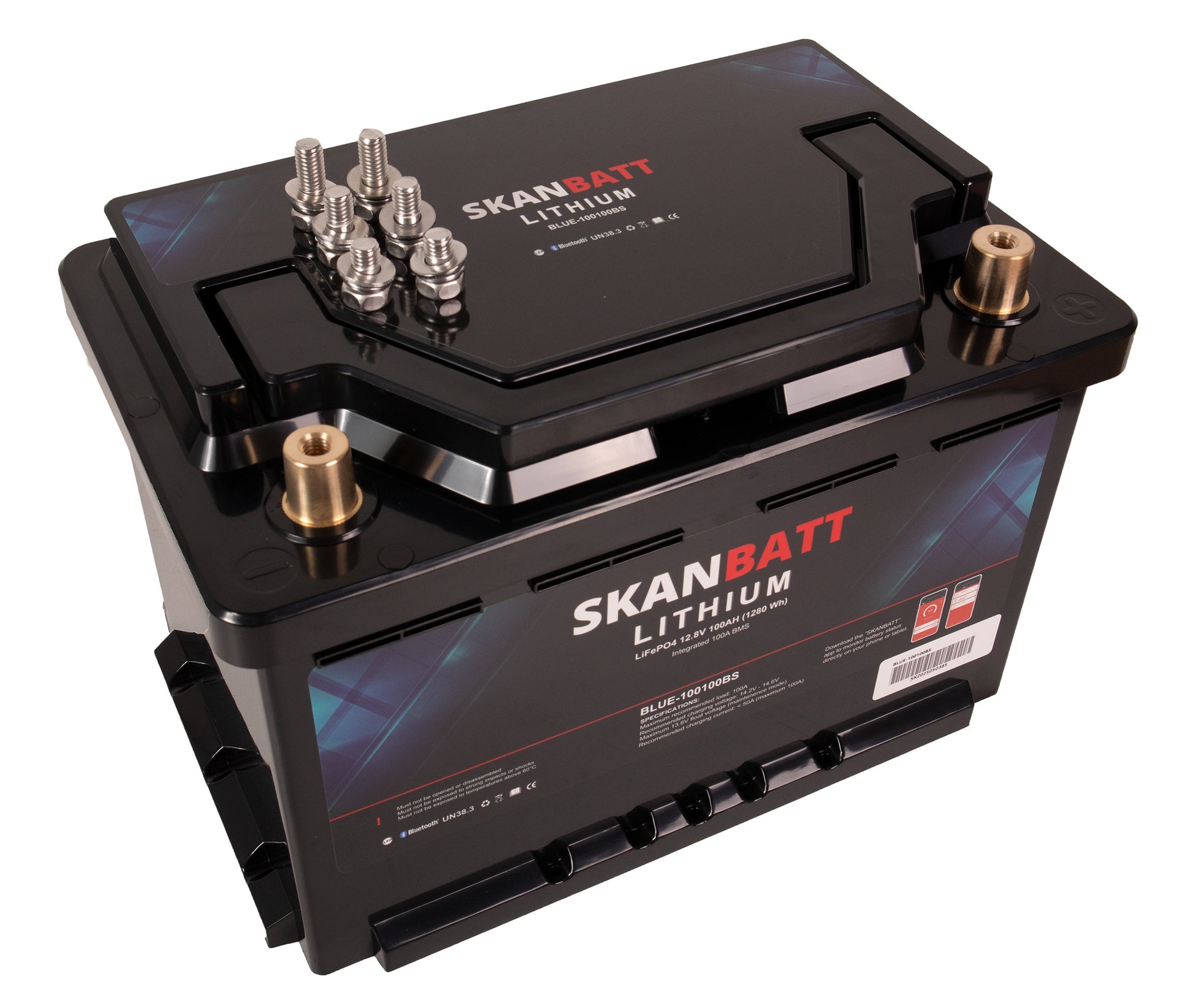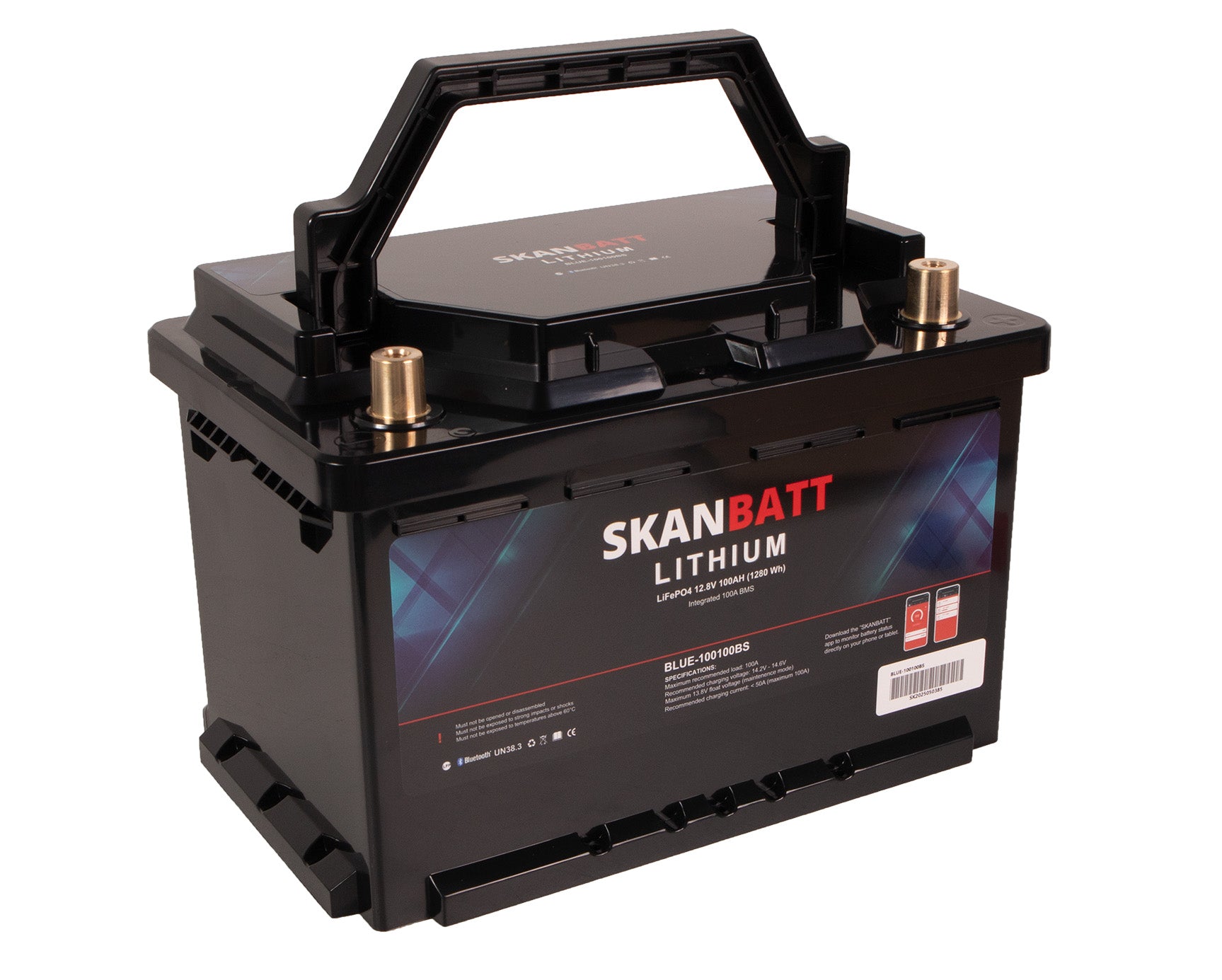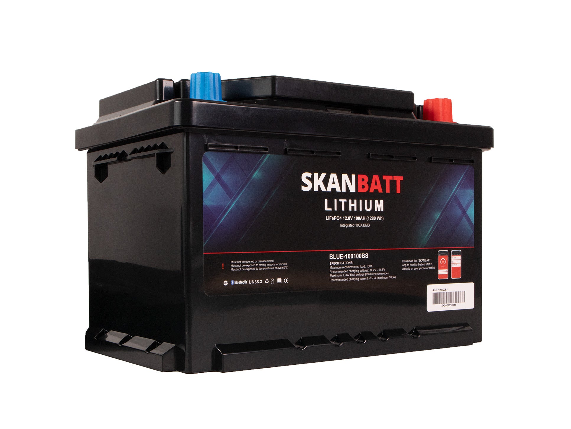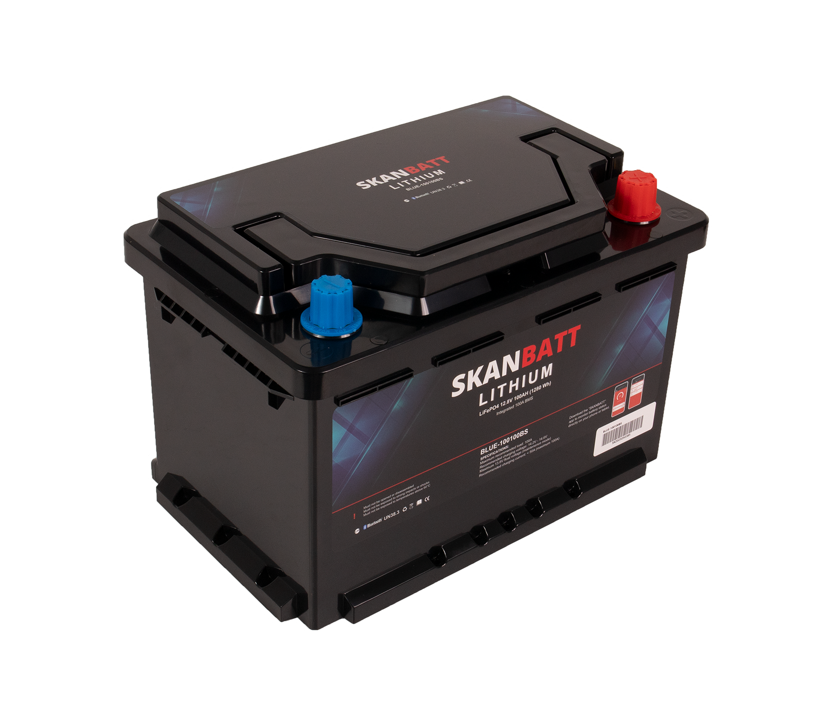 SKANBATT Lithium Batteri 12V 100Ah 100A BMS - Bluetooth - Bobil. Modell BLUE-100100BS i kompakt Small-format 279x176x190 mm.