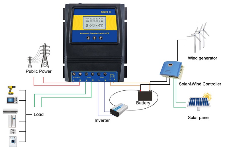 NOVA ATS er en automatisk transfer switch for solcelleanlegg med batteribank. Den leverer strøm til en 230V forbruker fra inverter så lenge batteriene har tilstrekkelig kapasitet, og bytter automatisk til landstrøm når grensen er nådd. Når batteriene er fulle igjen, kobler den tilbake til inverter.