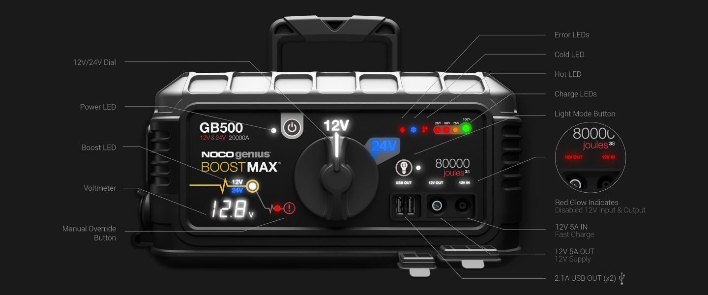 NOCO GB500 er en kombinert 12V og 24V lithium startbooster med 20 000 Amp (max) for start av store bensin- og dieselmotorer. Enheten er lett, kompakt og samtidig svært kraftig, egnet for krevende oppgaver.