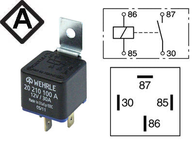 Rele No Wehrle 30A er et pålitelig og høykvalitets rele fra Wehrle i Tyskland, kjent for sine produkter i motorindustrien. Dette releet er designet for å håndtere opptil 30A ved 12 volt.